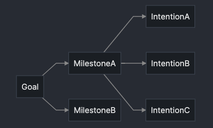 So, when it comes to managing my goals, I like to break things down. For each of my goals, I break them down into three parts: the overarching goal, the included milestones, and the intentions that are associated with each milestone. Here’s a diagram (created using Obsidian via their support for Mermaid diagrams):