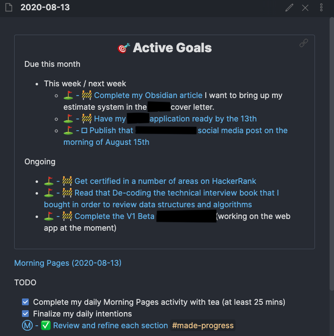 The great thing about the Active Goals note is that I embed it into all of my daily notes, which serves as a calendar for my goal deadlines. Here’s a a picture of the daily note from yesterday: