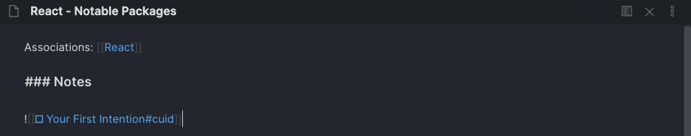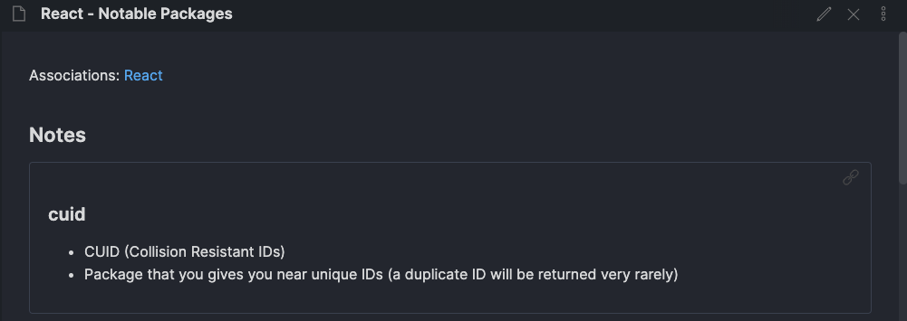When I want to save some knowledge for later reference, I add it to the bottom of an intention. In this case, I’m saving some notes about a notable package that can be used with Javascript and other languages, called cuid.