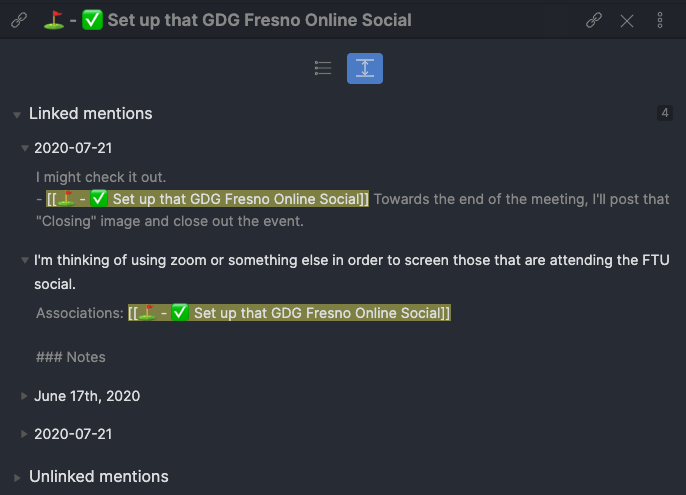 This is showing the linked mentions for a goal of mine that was related to setting up a tech-focused online social for my hometown. The great thing about this version is that Obsidian has added the ability to see more of the context around the linked mention. Additionally, they have added the ability to collapse linked/unlinked mention results. They don’t offer the ability to filter mentions at the moment, but it would make sense for them to eventually add it.