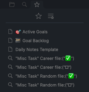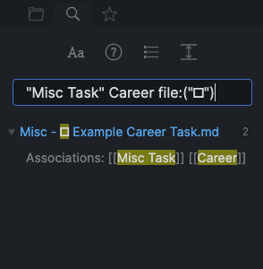 I use Obsidian’s saved search query feature in order to easily list the different types of miscellaneous tasks that I have assigned myself. Here are two examples of what you can expect: