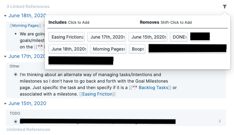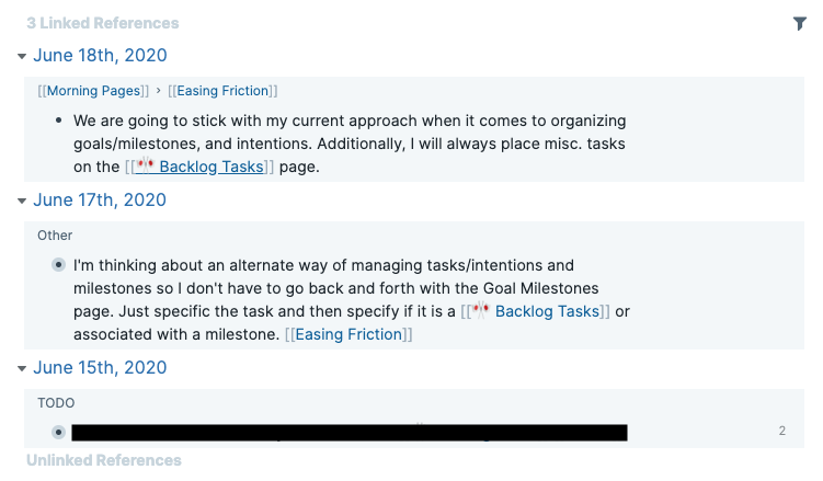 In the first picture, you will see the linked references that are at the bottom of my 🎌 Backlog Tasks note. In the second picture, you will see what happens when I click on the filter button that’s to the upper right. This allows you to filter the listed blocks/references.