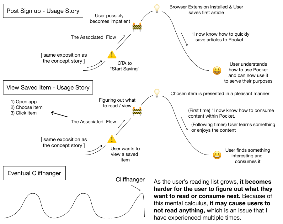 After completing Read It Later’s concept story, I wanted to dig deeper into Pocket’s end-to-end experience. So, I took two other tools from that book, i.e. a origin story and a usage story. They both are broken up into 7 parts, like the concept story.