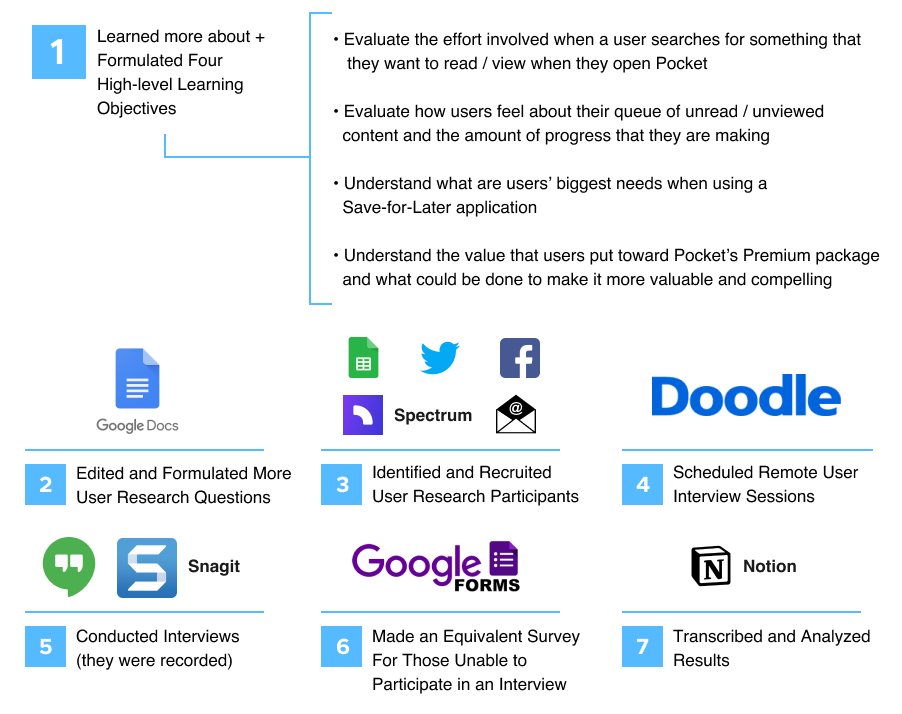 This included the following: research planning, remote user interviews, surveys, and data analysis.