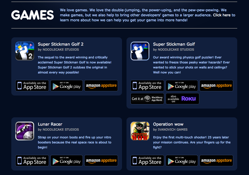 For Noodlecake Studios’ website, I liked how they introduced each section and how they listed their games. I wanted to do something similar for the apps that ScholarDev would build.
