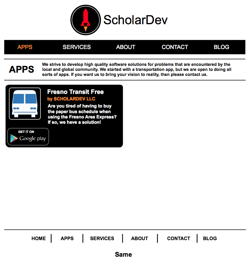 ScholarDev LLC arose from a class project that challenged us to create a transportation app for Android that would be used by the student population at Fresno City College. After the class ended, a few of us formed a professional team with the aspiration of creating mobile apps that focused on improving the community and the environment.