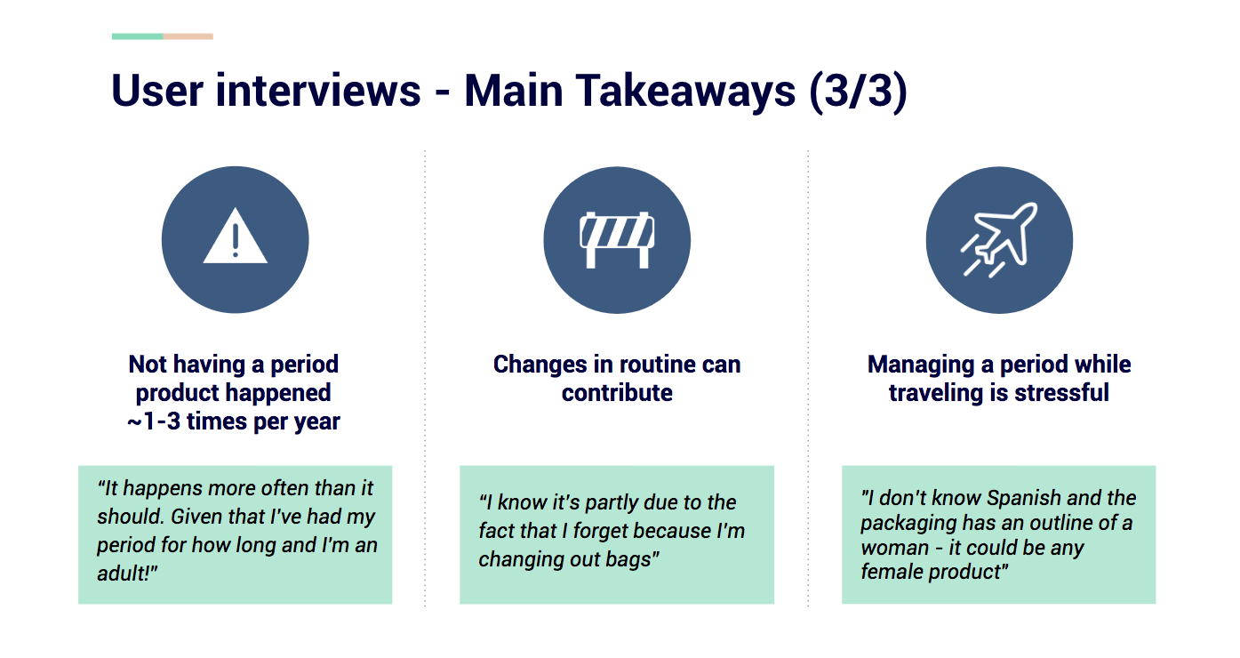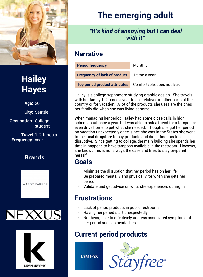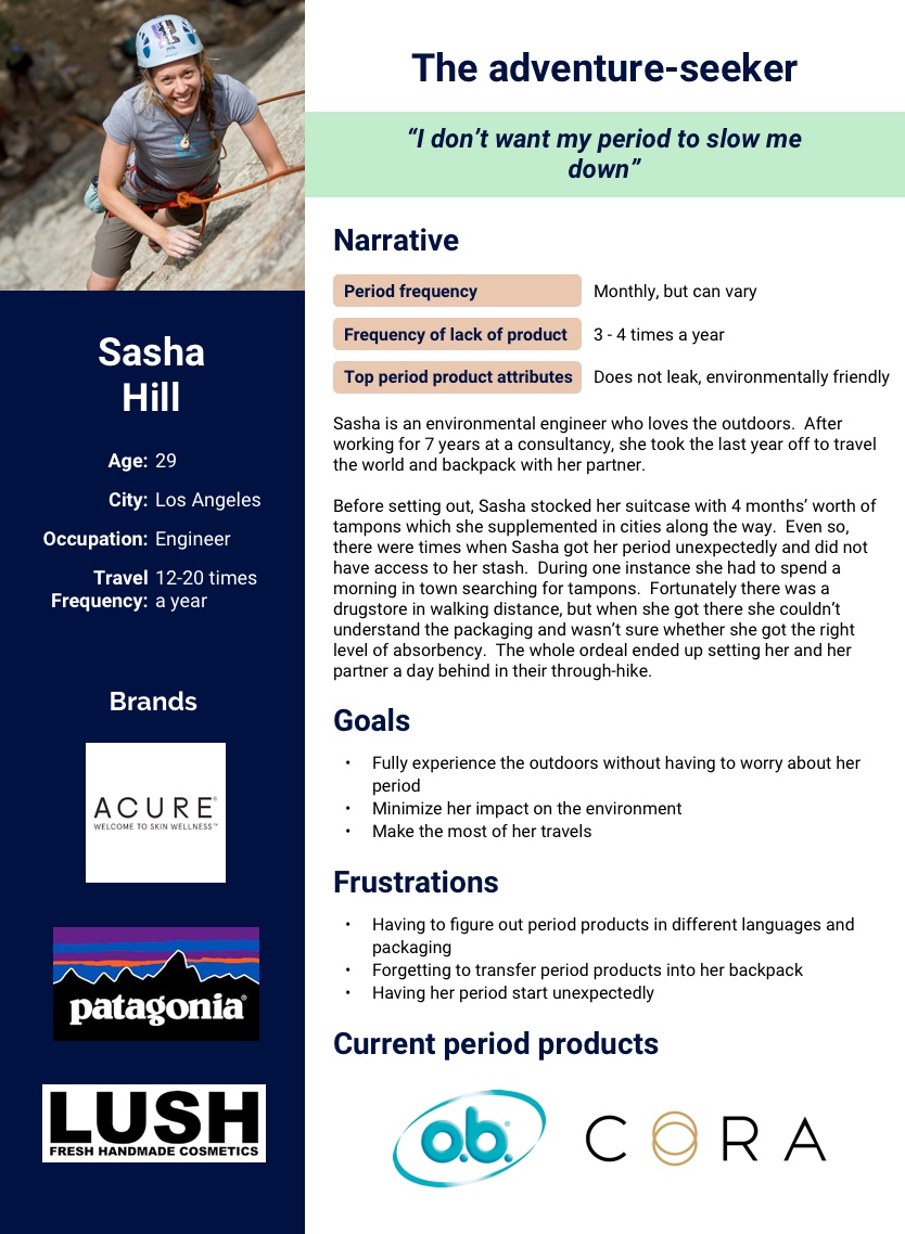 Based on some early data, I suggested that we could split up the personas based on who was prepared for the unexpected situation of being on your period when you least expected it. However, when comparing the data from all of our sessions, we could see that everyone had their period management routine down to an extent. Besides that, we could see that were two characteristics that was represented heavily: professionals and travelers. So, it made sense to create two personas that were representative of these characteristics.