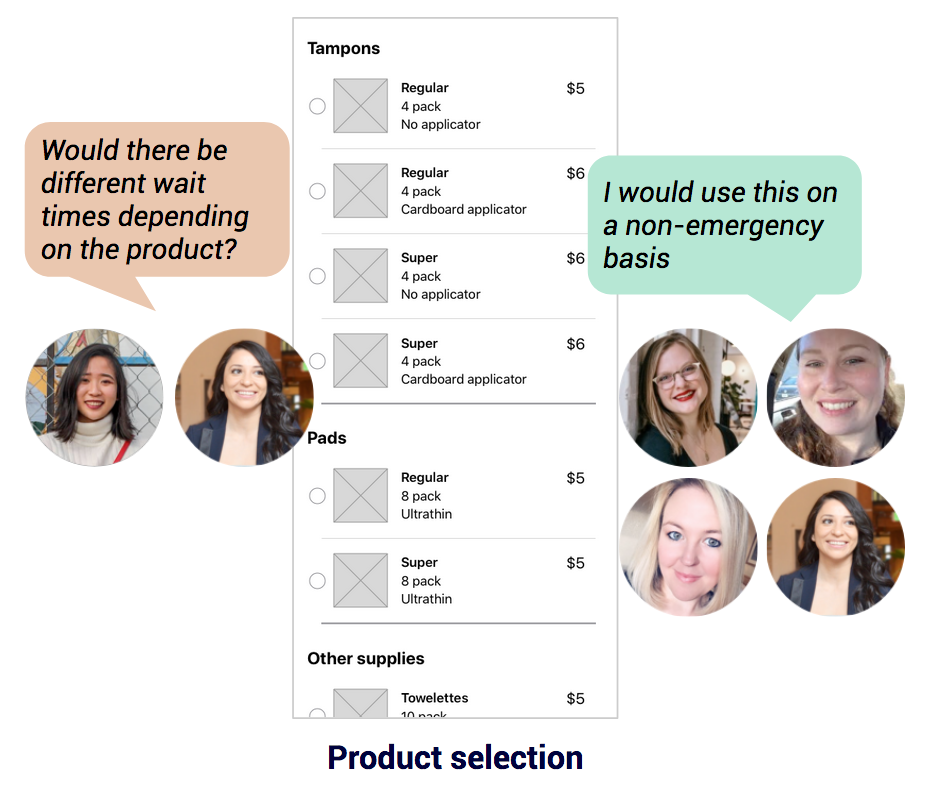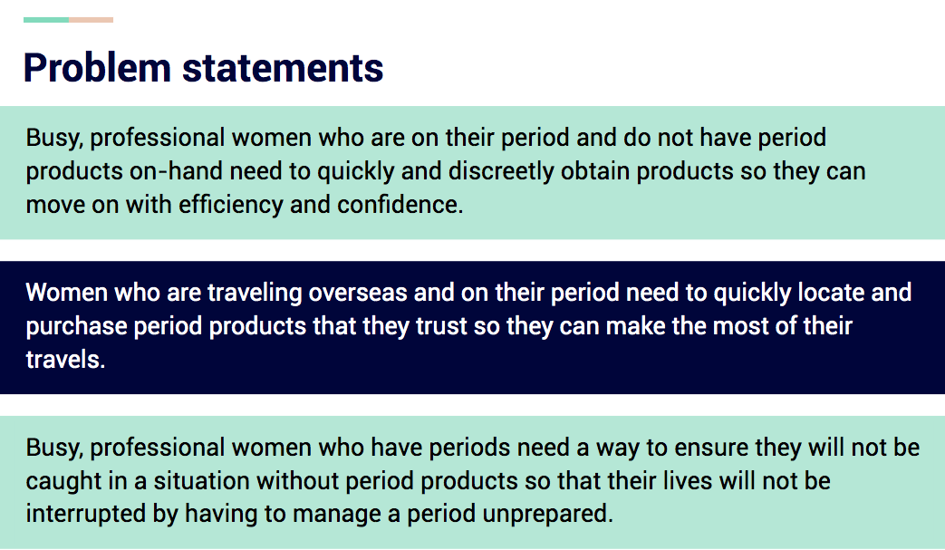 - As a user who needs a period product in a foreign country, I want immediate access to period products as I’m dealing with an emergency and don’t have the time to personally figure out where to purchase these products.