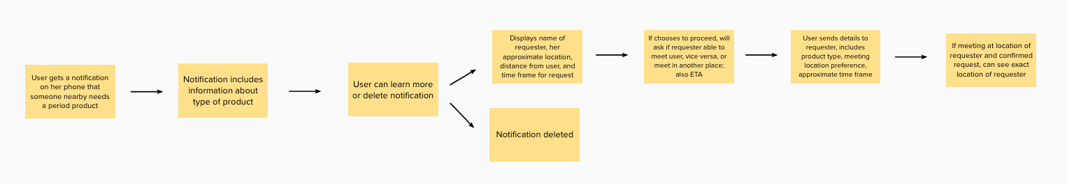 Choose period product ⇒ See search process (distance slowly increases) ⇒ See nearby app users who could help ⇒ Select one or more users ⇒ Select a meeting location from a list of recommended locations (as a suggestion) ⇒ Select a time frame (as a suggestion) ⇒ Send request