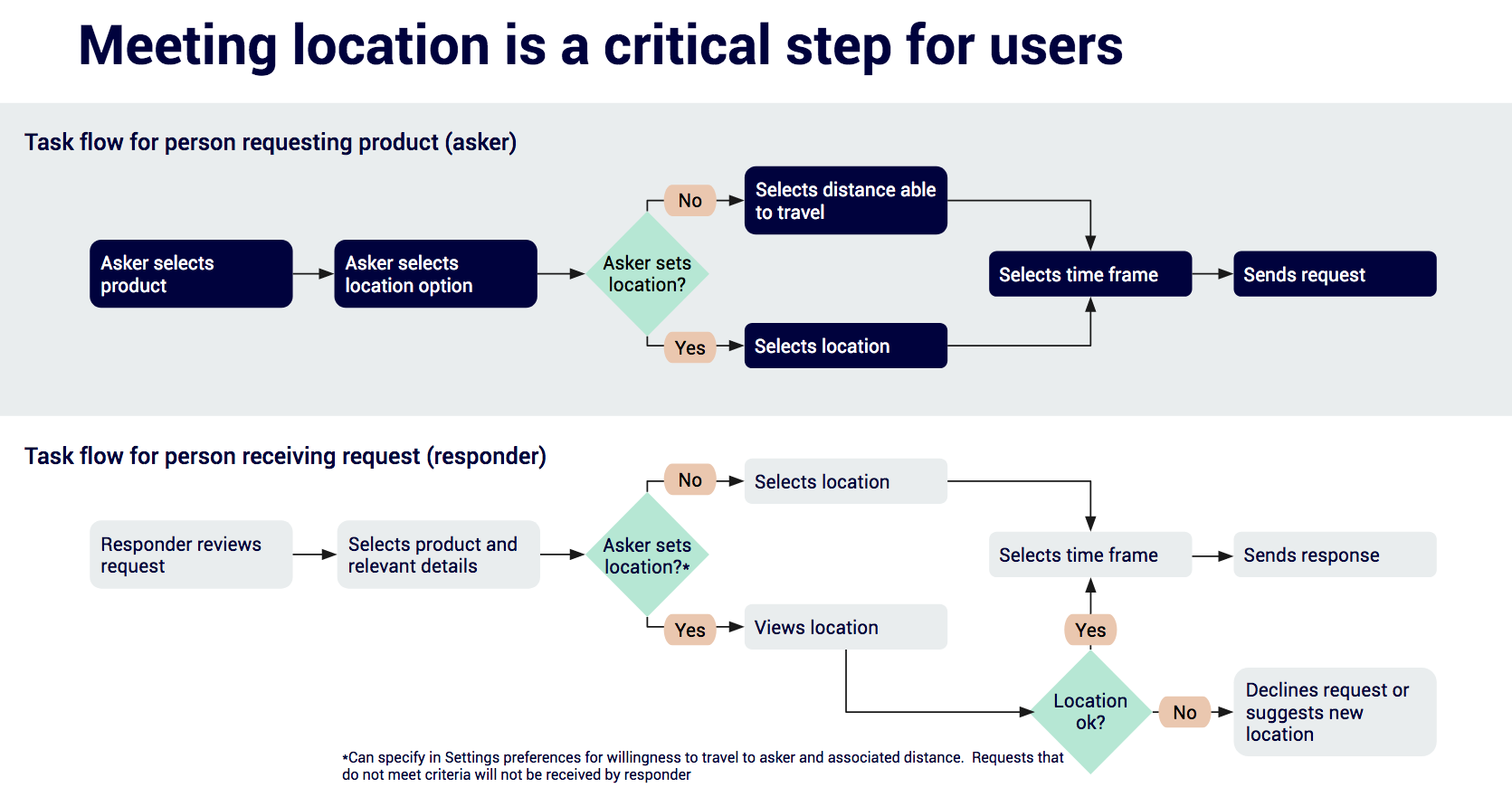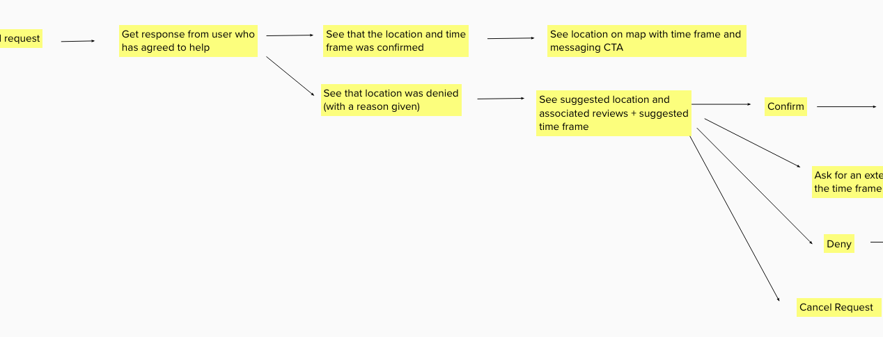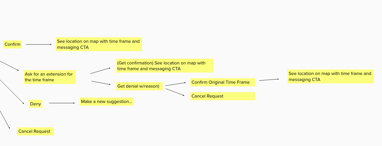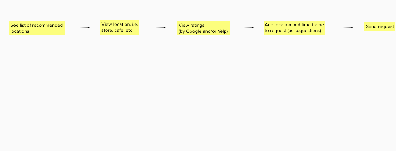 While creating these wireframes, it became apparent that the step where the user chooses the meeting location was a crucial part of the process. So, the request and request received flows revolved around this choice.