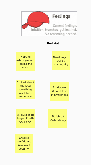 At the end of the meeting, Dorothy and I co-led a 6 thinking hats activity. During this activity, we had the client and her teammate think about this endeavor from different perspectives. Here’s a full picture of the results and a snapshot that you can read: